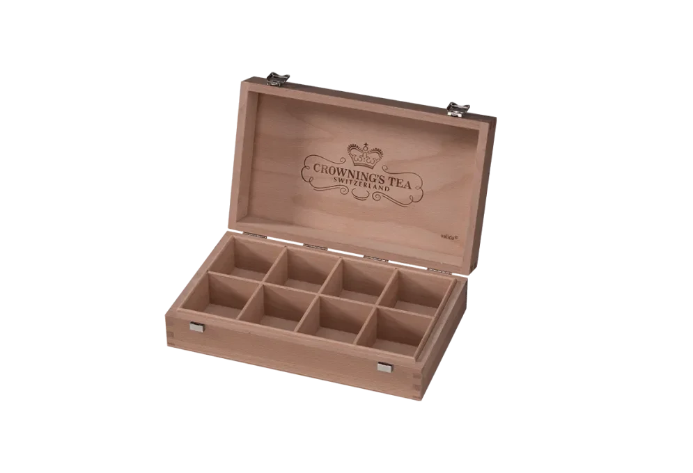 Ansprechende Teebox aus Buche massiv, lackiert und mit Klappdeckel. Dieser Dispenser wurde individuell für unseren Kunden mit einem Siebdruck versehen.