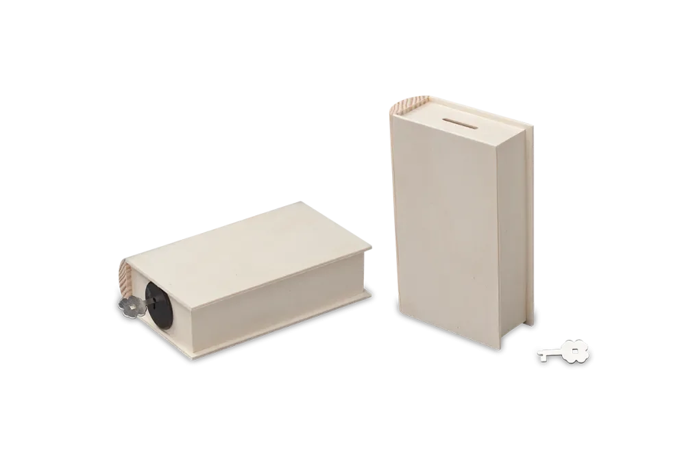 Sparkasse aus Holz praktische in Buchform, die man zur Tarnung ins Bücherregal stellen kann. Ideal für ausgefallene Werbegeschenke, Werbeträger oder Präsentationshilfe