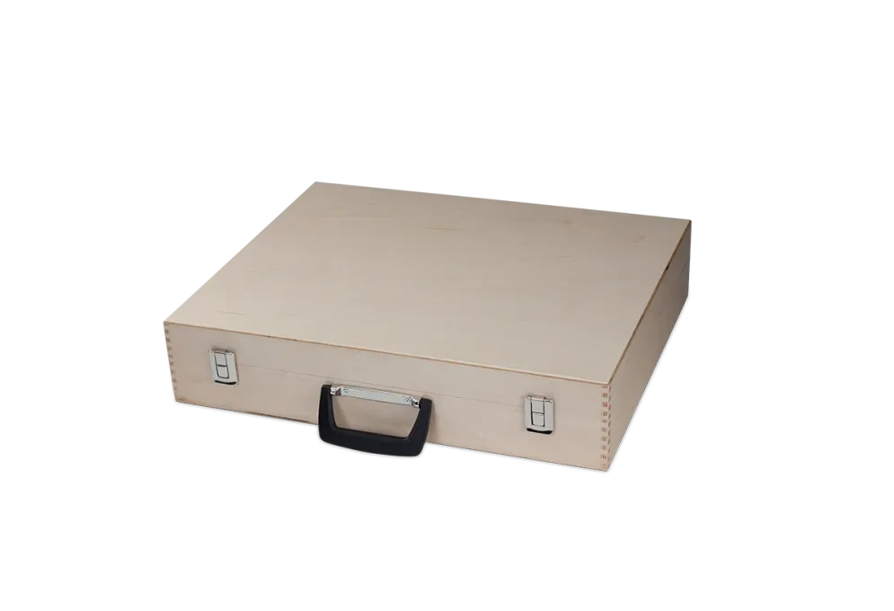 Wooden case made of birch plywood with screwed hinges and plastic handle.